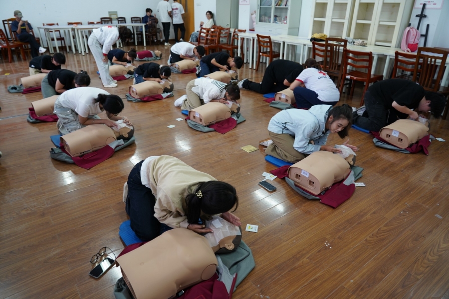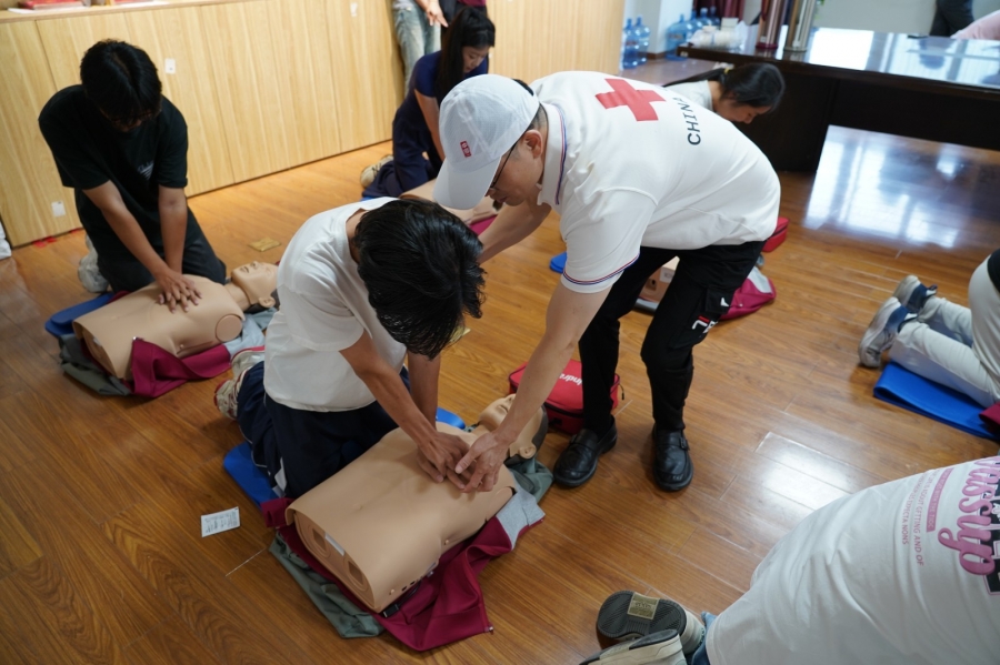 理论学习后,实操演练环节有序展开。参训学员分为两组,借助模拟人和 AED训练机进行实战操作。讲师团队全程巡回指导,针对按压手法不规范、气道开放角度不足等细节逐一纠正,帮助学员熟练掌握标准化操作技能。